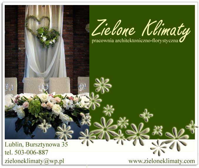 Nasza firma oferuje Państwu profesjonalną oprawę kwiatową wszelkiego rodzaju imprez okolicznościowych. Oferujemy nowoczesne oraz tradycyjne wiązanki ślubne, przypinki kwiatowe, bukiety, dekoracje kościołów, aut, sal imprezowych oraz realizację niestandardowych zamówień florystycznych, jak również biżuterię autorską. Posiadamy bogaty warsztat techniczny i wykształcenie kierunkowe. Lublin i woj. lubelskie.